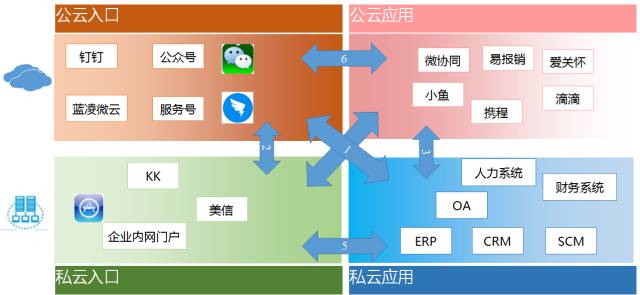 后互联网时代,伴随着新兴技术的渗透,企业信息化环境越来越复杂,既有阿里钉钉、微信等公云端入口,也有蓝凌KK、美的美信、掌中金地等私云端入口;而企业应用系统除了像OA、CRM、HR、ERP、PDM等私有化部署应用,更有像爱关怀、携程、滴滴、uber、全时等公有云应用……如何将各种入口能力与应用系统进行相互连接、整合,打通内外的数据,实现统一多入口、多应用的高效协作?
